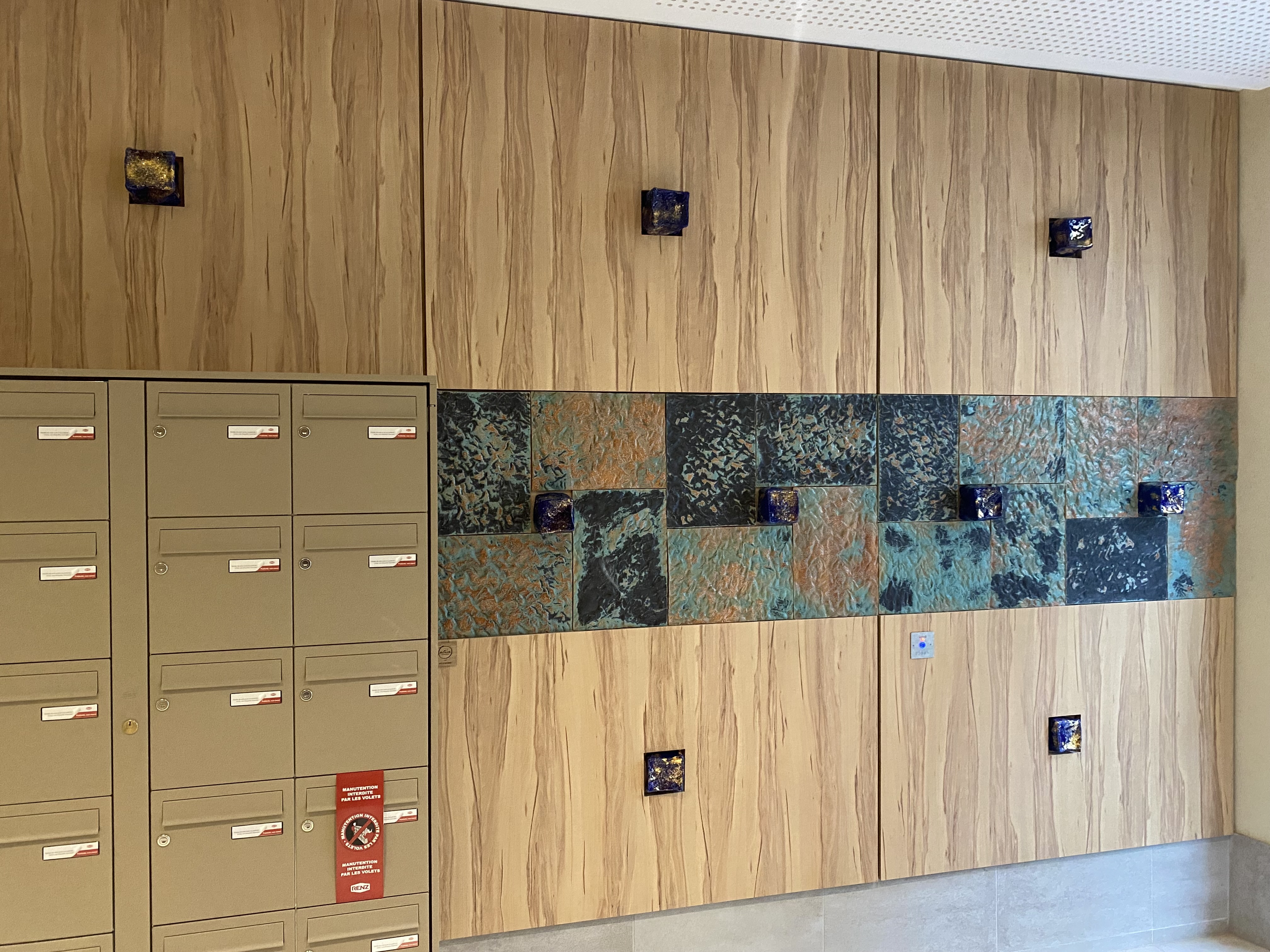 Une série de cabochons de porcelaine émaillée, dorée, de la taille des petits pavés parisiens, percent une frise de seize plaques en grès texturé.