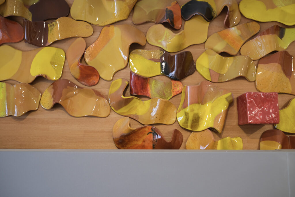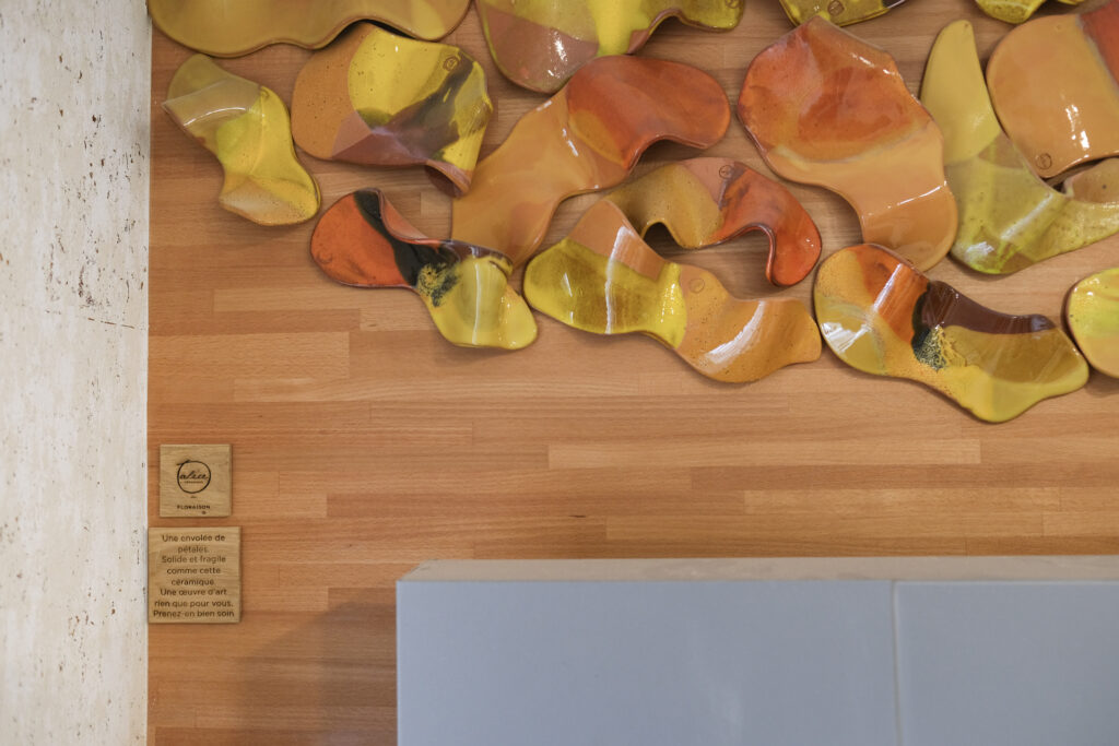 Dans les deux halls de cet immeuble, des pétales de faïence